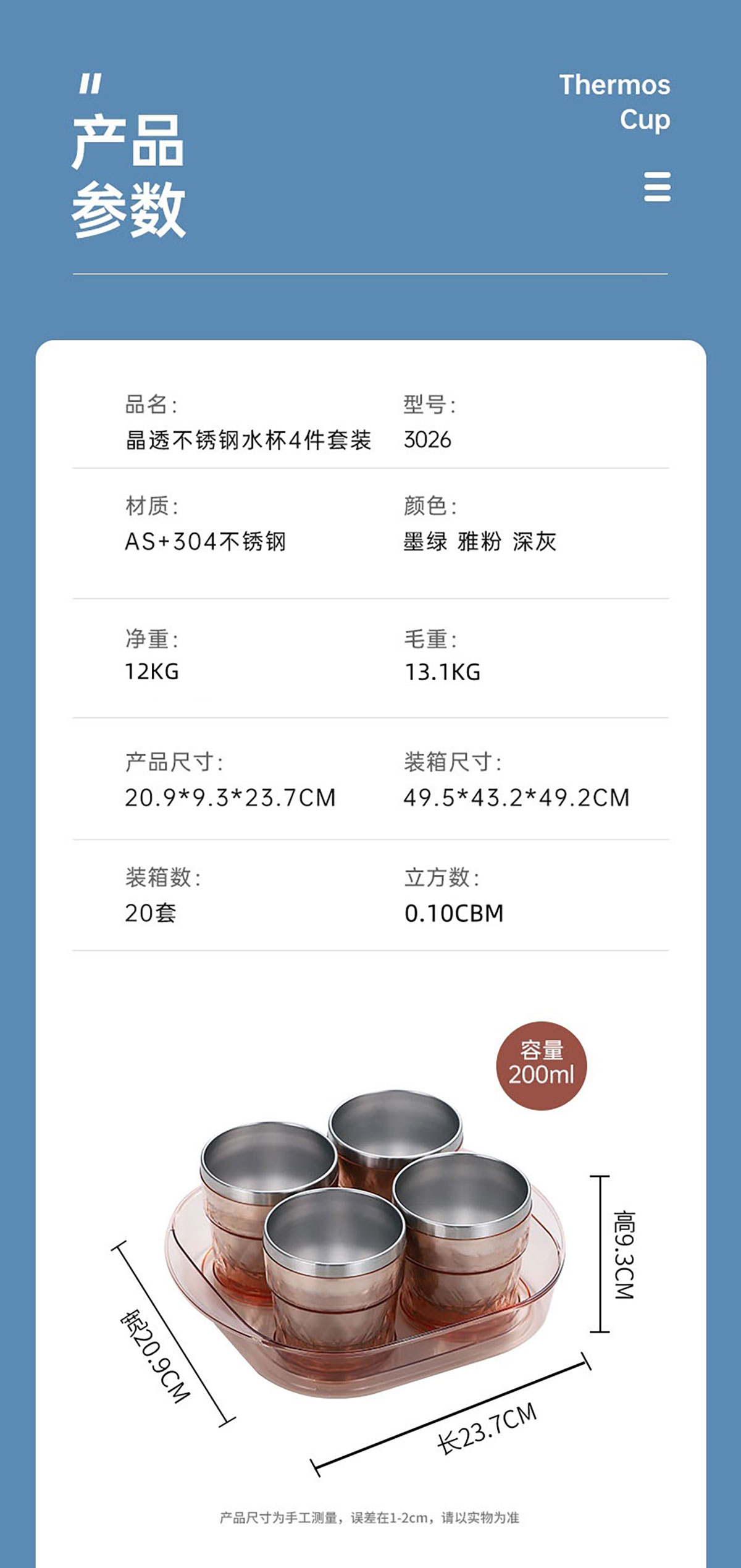Size: 209*93*237mm/單個(gè)水杯:85*91mm/200ml