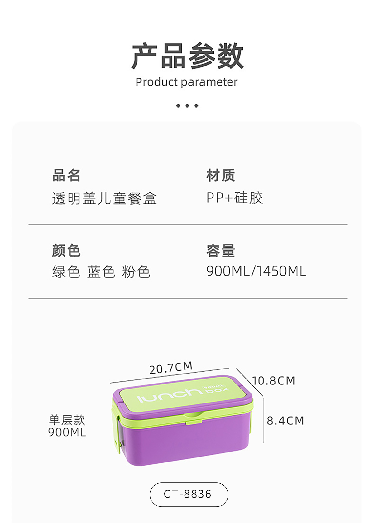 Size: CT-8835(雙層):207*108*127mm/550ml+900ml CT-8836(單層):207*108*84mm/900ml